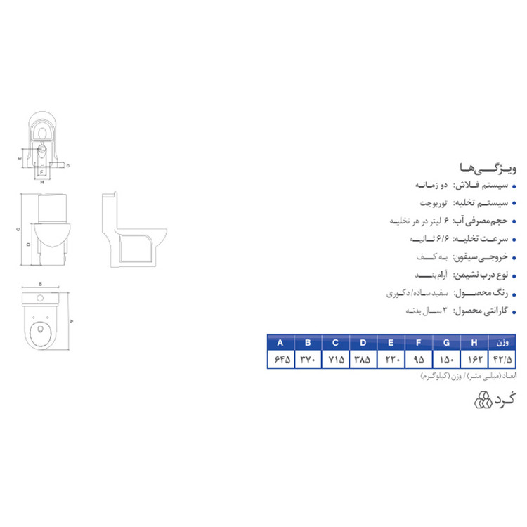 | ابعاد توالت فرنگی(سانتیمتر) | طول: 64.5 ، عرض: 37 ، ارتفاع: 71.5 |