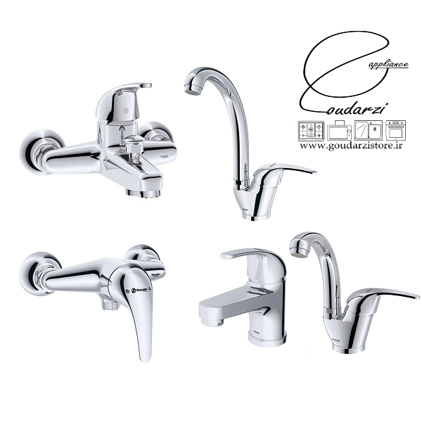 - ست چهارتکه شامل: روشویی پایه کوتاه، شیر توالت، شیر حمام، شیر ظرفشویی