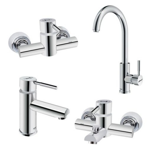 - ست چهارتکه شامل: روشویی پایه کوتاه، شیر توالت، شیر حمام، شیر ظرفشویی