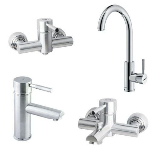 - ست چهارتکه شامل: روشویی پایه کوتاه، شیر توالت، شیر حمام، شیر ظرفشویی