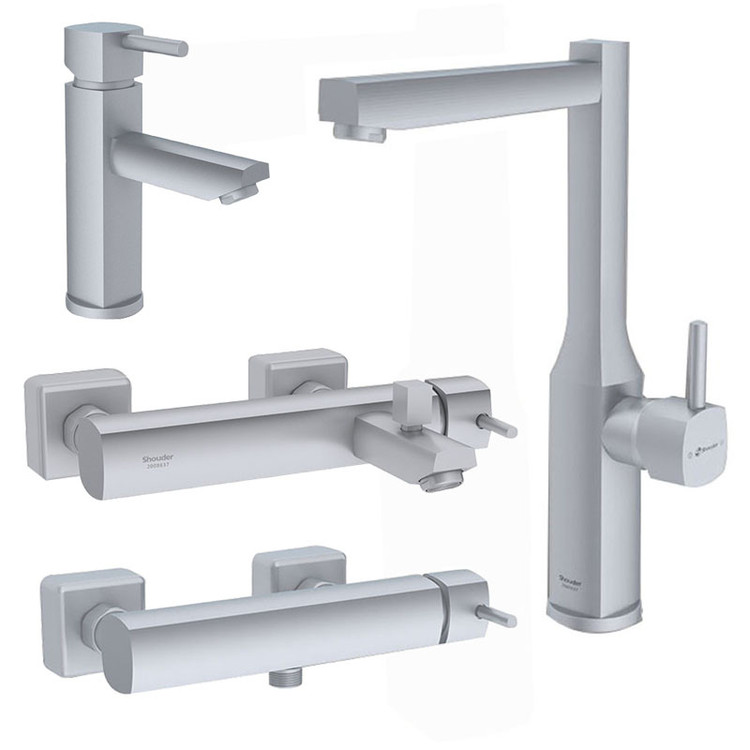 - ست چهارتکه شامل: روشویی پایه کوتاه، شیر توالت، شیر حمام، شیر ظرفشویی