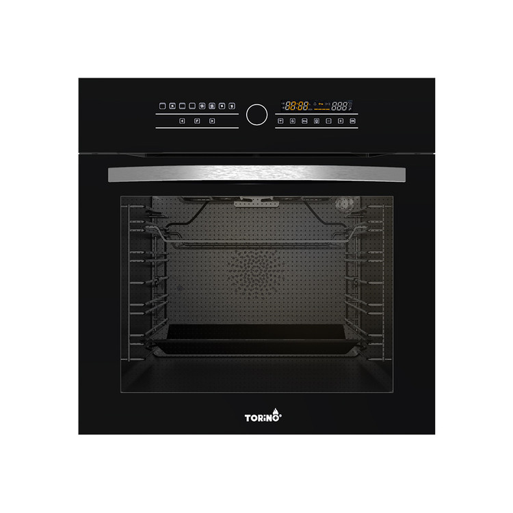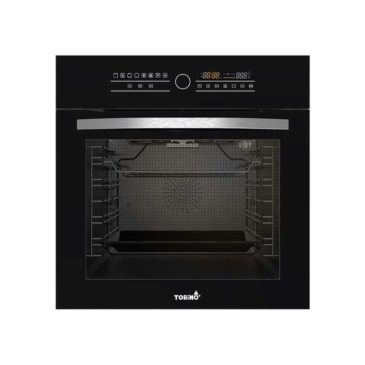 فر توکار برقی تورینو پلاس مدل TO2 به رنگ مشکی است و جنس سطح بیرونی ان شیشه سکوریت میباشد . شیشه سیکوریت سه لایه فضای داخلی فر را ایزوله میکند و کیفیت پخت غذا را بالا میبرد . ابعاد فیزیکی فر برقی تورینو پلاس (60*60*55) سانتی متر است . صفحه کنترل لمسی تاچلس در بالای فر ظاهری مدرن به این محصول بخشیده است . با کمک قابلیت تاچ لس میتوانید از دور و با حرکت دست برنامه های پخت را انتخاب کنید یا تایم پخت را تنظیم کنید . درب متحرک سه لایه به اسانی به سمت بیرون باز میشود و با جک به بدنه متصل است . دسته استیل تعبیه شده بر روی درب فربه گونه ای طراحی شده که حین روشن بودن فر دسته داغ نشود و بتوان براحتی درب را باز نمود . محل قرارگیری سیخ جوجه گردان در وسط فر تعبیه شده تا بتوانید انواع مرغ ها را در فر بپزید . برای گردش هوا داخل کابین و یکدست پختن غذا در فر فن های کانوکشن در بدنه ان تعبیه شده است . در ساخت این فر چهار المنت بکار رفته است .